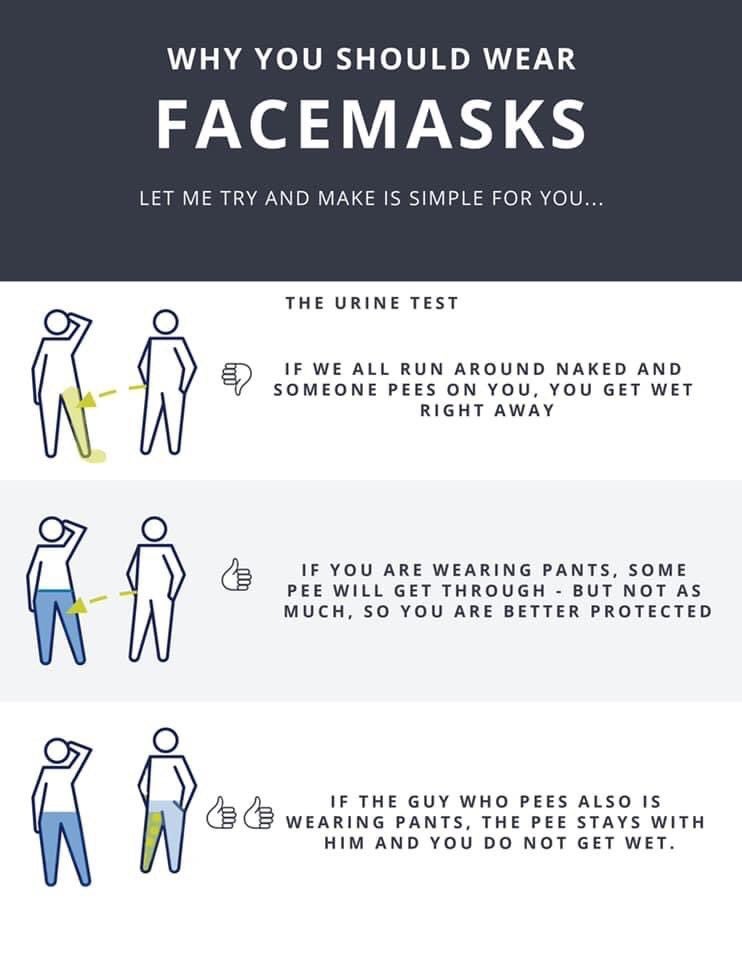 Here are some links to scientifically backed articles on why masks work in conjunction with social distances and good hand hygiene. NOBODY is saying masks are the end all be all of stopping the spread of COVID-19. The only mask that can truly stop the spread of COVID 19 is a N95 that has been fit tested to you and allows zero particles in. However, as the image above shows, imagine if you are not wearing anything at all and you get coughed on by someone with COVID who also is not wearing anything. But if you are both wearing a mask, even if you’re not 6′ apart, you are safer than if you aren’t. If your not going to do it for yourself, STOP BEING SELFISH, then think about others! If you can’t be kind enough to protect others, then stay home!